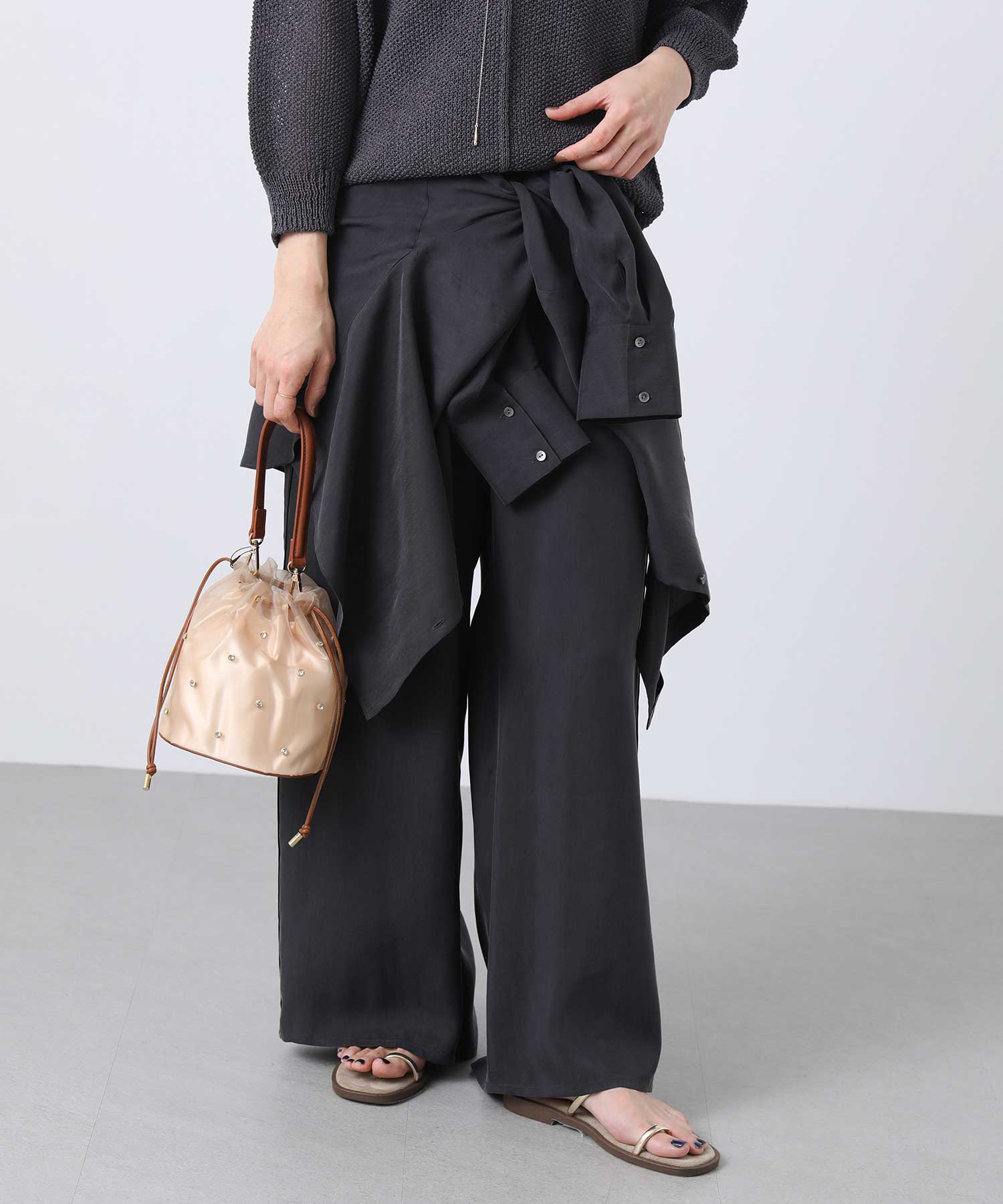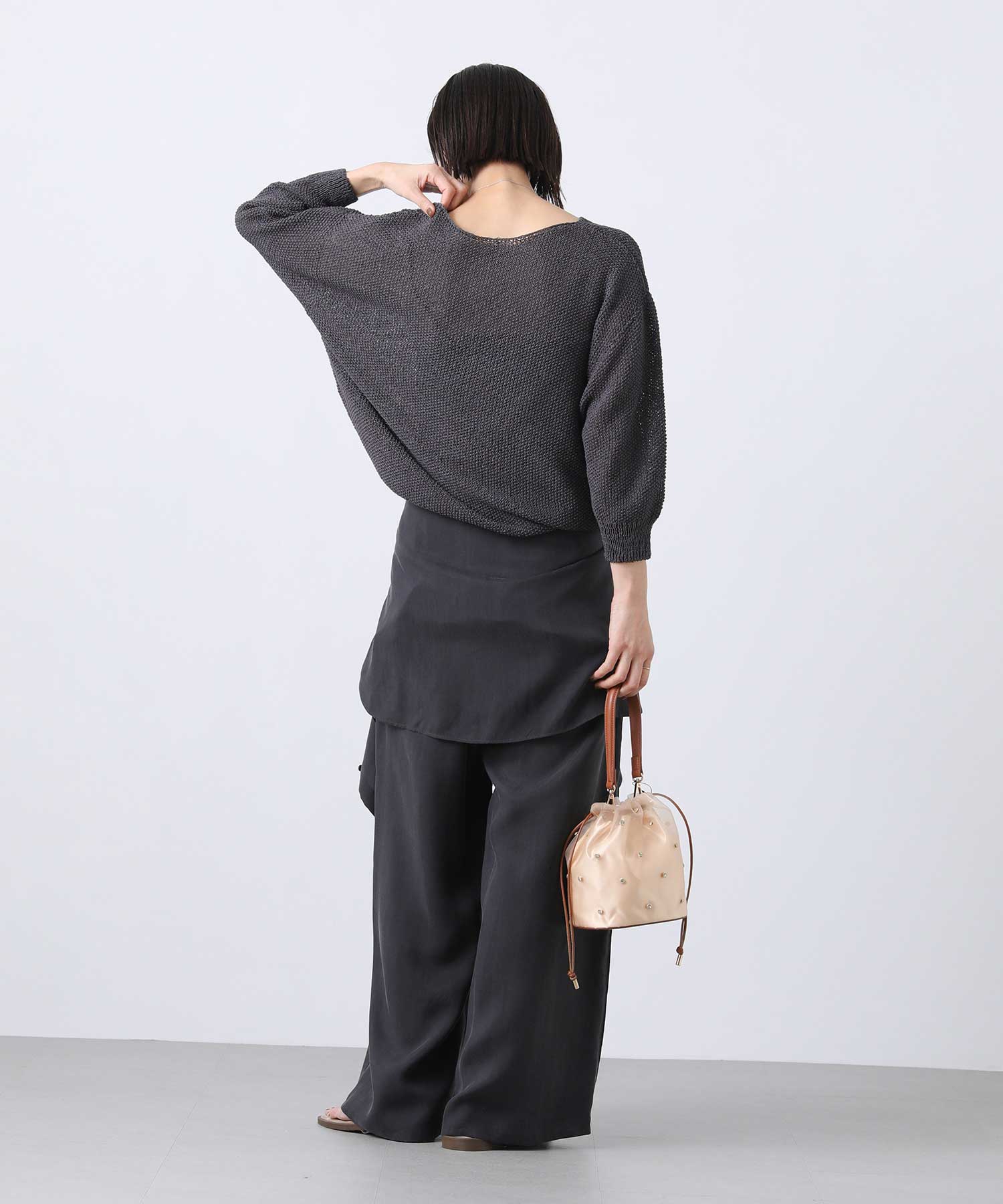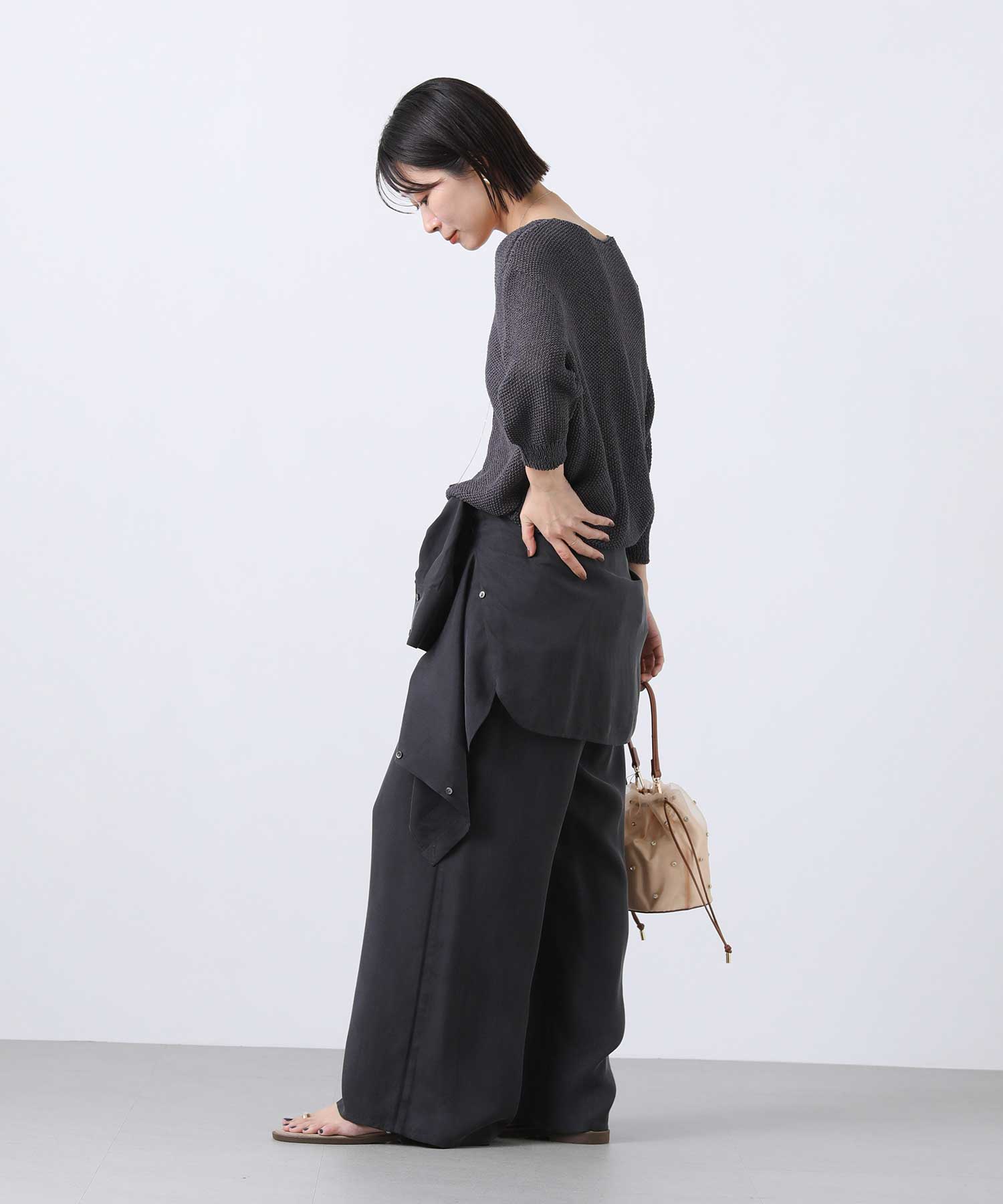 骨格ナチュラルが得意なゆるっとコーデをワントーンで大人っぽくまとめました。ドライタッチなペーパーヤーンのニットにとろんと上品な風合いのパンツを合わせて、素材に変化をつけたスタイルに。小さめのバッグで、身軽に陶器市に出かけたいです。