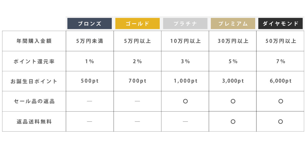 ※ランクアップは毎月おこなっております。月末までのお買上金額に応じて、翌月の10~15日に更新いたします。